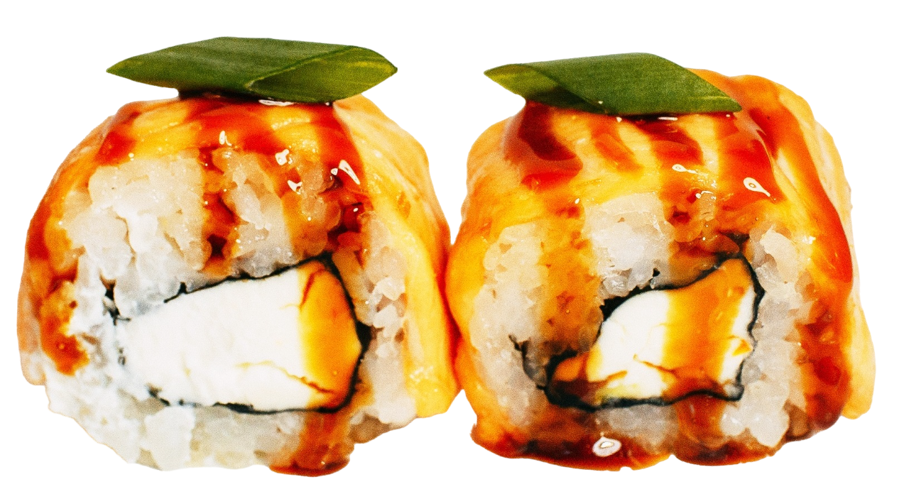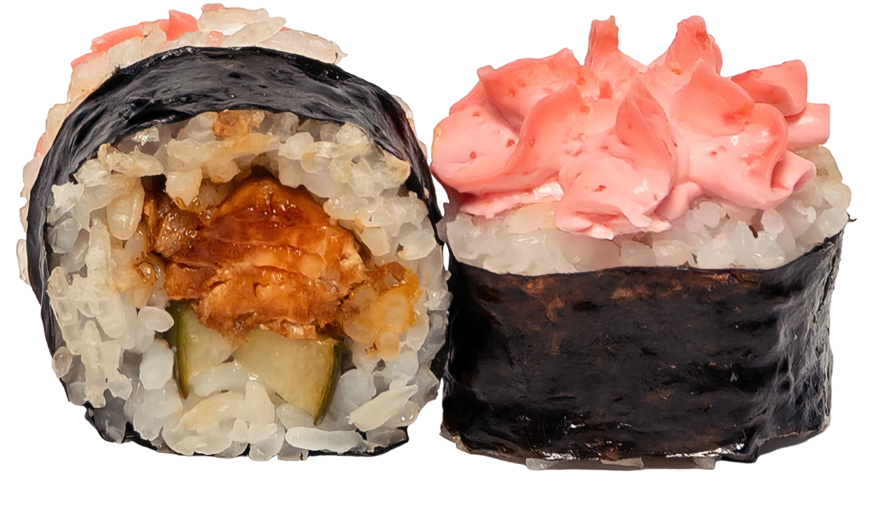 Нори, рис, лосось, творожный сыр, унаги соус, зеленый лук.